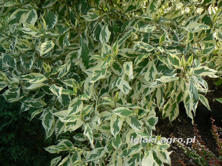 Liście są zielone z szerokim, nieregularnym, kremowobiałym obrzeżeniem, co nadaje roślinie lekkości i rozjaśnia kompozycje ogrodowe. Jesienią ulistnienie często przebarwia się na różowo i purpurowo. Zimą szczególną ozdobą krzewu stają się czerwone pędy, wyraźnie kontrastujące z jasnym tłem.