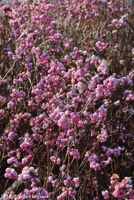 Jesienią roślina obsypuje się kulistymi, błyszczącymi owocami o intensywnie różowej barwie, które są znacznie większe i liczniejsze niż u tradycyjnych śnieguliczek. Owoce pozostają dekoracyjne od jesieni aż do zimy, stanowiąc silny akcent kolorystyczny w ogrodzie.