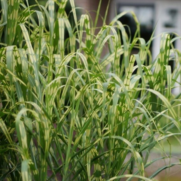 Miskant olbrzymi ‘Alligator’ (Miscanthus × giganteus) – bardzo wysoka odmiana o szerokich, pasiastych liściach